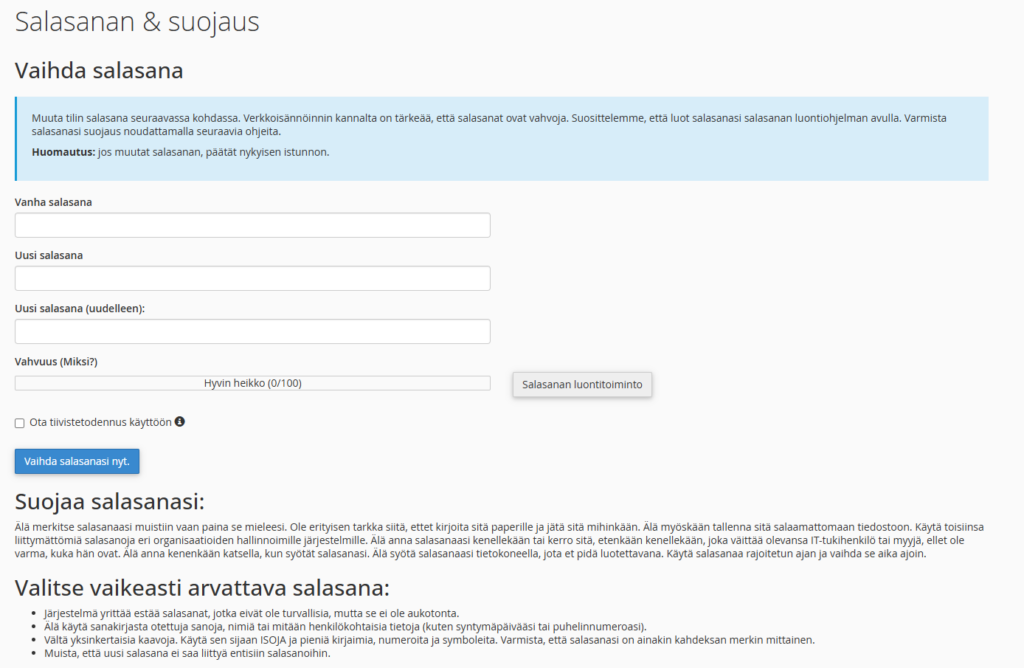 Voitte vaihtaa cPanelin salasanan Salasanan & suojaus valinnan alta. Syöttäkää ensin vanha salasana ja sitten uusi salsana ja vahvistakaa uusi salasana vielä kertaalleen.